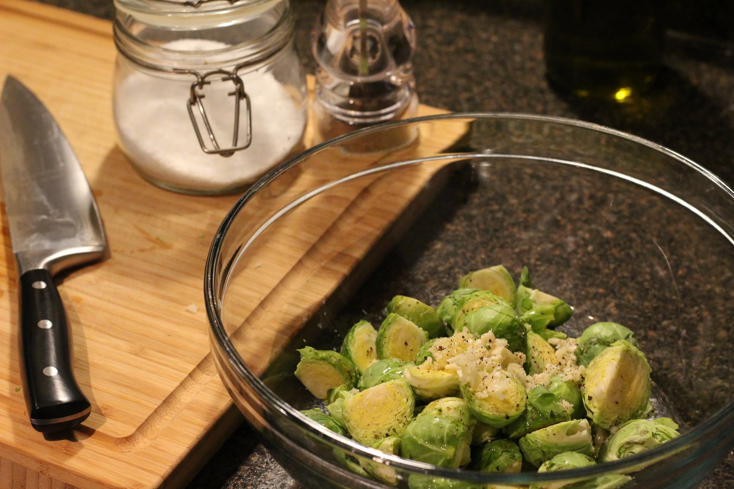 Halved Brussels sprouts tossed with minced garlic, olive oil, salt, and pepper - it's all you need for a really good time.